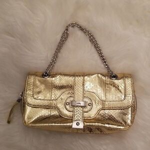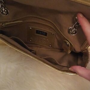 Beautiful gold clutch. Chain can be worn long or short. Has zippered expansion on the bottom. Interior key fob, zippered pocket and patch pockets. Some wear to metal as shown in photos.