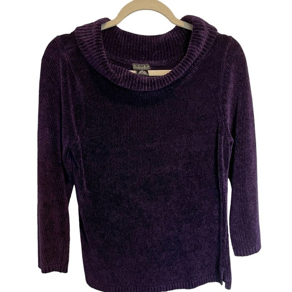 Stay cozy and comfortable with this Rafaella Cowl Turtleneck Women's Top. The knit fabric is made from a blend of cotton, spandex, and rayon/acrylic, making it breathable and perfect for fall, winter, and spring. The 3/4 sleeves and solid pattern give it a classic, timeless look that's perfect for any occasion, whether you're dressing up for a business meeting or keeping it casual on a weekend getaway. This sweater is a size M and features a classic fit that flatters any body type. The plum color adds a pop of color to your wardrobe, and the cowl turtleneck and knit accents add a touch of texture and style. Layering Piece. Dry clean only for best care.