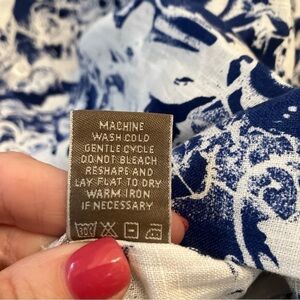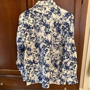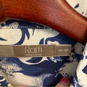 Stylish button-down shirt by Raffi. Features a blue and white abstract pattern. Perfect for casual outings.