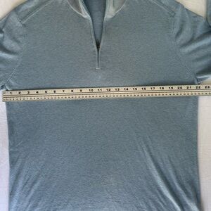 Luxury meets comfort with this Raffi quarter-zip sweater. Crafted from a soft cotton-cashmere blend (85% cotton, 15% cashmere), it’s perfect for layering or wearing on its own. Features a ribbed mock neck, YKK zipper, and lightweight knit in a versatile light blue. Size Large.