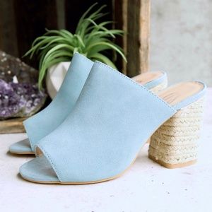 Raffia Heel Powder Blue Suede Leather Mule NIB
