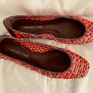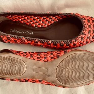 Cute and fun warm coral color raffia and dark brown PVU ballet flats. SIZE 9 1/2M. In very good condition. While they look narrow, they're very forgiving.
