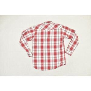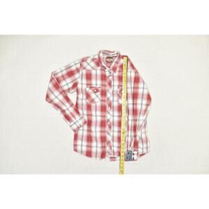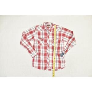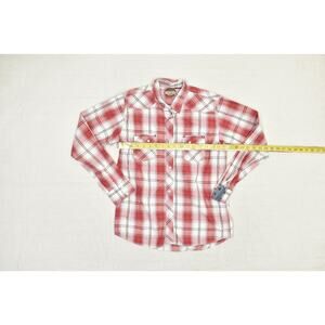 This Rafter C Collection men's western shirt is in excellent used condition. It features a striking red and white plaid pattern and a classic western style with pearl snap buttons on the front, cuffs, and chest pockets. The shirt is a Regular Size XXL and is made from a comfortable blend of 55% cotton and 45% polyester. The long sleeves make it suitable for various occasions, from a casual day out to a country concert. The shirt has a button-down collar and a curved hemline. The overall fit is regular. Please see the detailed pictures for a clear representation of the item's condition and measurements. This is a great addition to any western-themed wardrobe.
