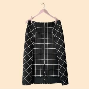 Super cute midi length wool-blend skirt by Rag & Bone in black with white windowpane print. The fabric has a nice, thicker feel to it. Features a front zip and slightly shorter length in the front. It's in excellent preowned condition. Size 6. Measurements included in photos.