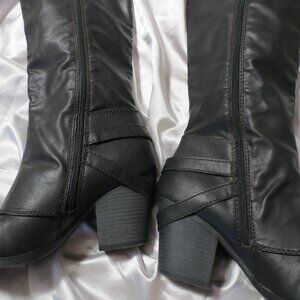 These lovely pair of boots are pre-owned, gently and hardly used. There are no damages of any kind. Interior is also in good condition. Heels are 3”, man made materials, front tip of the boot to the top of the boot is 18.5”. Size 8M.