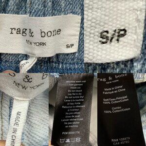 This Rag & Bone women's Miramar Relaxed Jogger Pant makes a statement due to it's cotton terry cloth fabric, mid rise, pull-on relaxed fit, elastic waist, jogger style, elastic cuffs, front pockets, faux back pockets, digitally printed faux jean look and blue shade.
