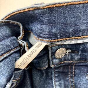 High waisted skinny jeans, ankle length with raw hem. Five pocket construction with manufactured whiskering and some of the fade is original. Medium wash, zipper fly, button closure.