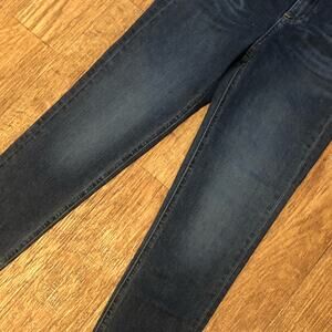 • Other information: Capri jeans with small slits at the hemline. Medium wash blue with light fading accents / whiskering. Button and zipper closure. Five pocket design. Silver hardware. Appears to be skinny fit through the legs.
