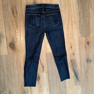 Rag & Bone Ankle Skinny denim jean with stylish designer distressing and raw bottom hem in size 24. Like new - washed but not worn. Medium to dark blue wash.