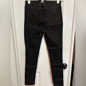 Skinny-fit stretch denim jeans in black. High-rise. Four-pocket styling. Lace-up fastening at back waistband. Concealed zip-fly with press-stud overlay. Silver-tone hardware. Tonal stitching.