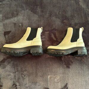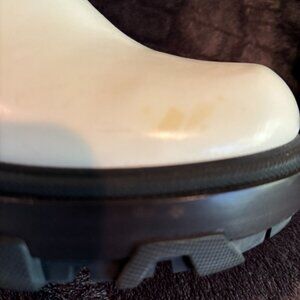Rag & Bone white leather ankle chelsea boots with black accents. Round-toes. Platform, lug soles in great shape. Some very light, minor discoloration (see photos) that can likely be buffed away. Super fun shoes but never reach for them!