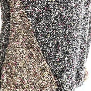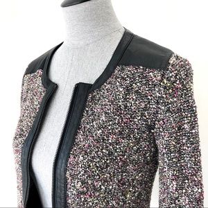 This blazer by rag & bone is a versatile, classy addition to your wardrobe! Woven, soft, and textured, the blazer has plenty of stretch for every day wear. Perfect for work or with jeans! Main panels are black and white with small colors specks woven in, and hip/side panel pieces have a copper/rose gold color to them. Leather trim details on pockets and front zipper! No pulls or flaws. Due to the stretch, this can easily fit a M and also some L.