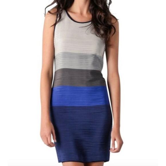 SIze small Rag & Bone blue and gray colorblock sleeveless tiered bodycon dress in excellent used condition. Tag has come loose on one side. 65% viscose / 35% nylon - The front is 100% silk.