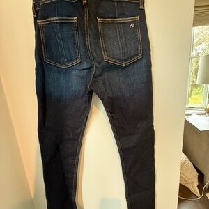 These Rag & Bone jeans feature a classic straight leg cut in a rich blue hue, offering a timeless and versatile style. The denim fabric showcases a subtle texture with depth and a slightly worn-in look, perfect for everyday wear. Enjoy the comfort and durability of these high-quality jeans, ideal for any casual occasion.