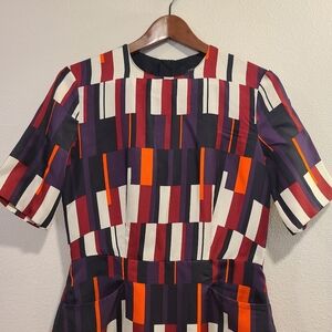Rag & Bone Bus Seat Anne Silk Mini Dress. A mesmerizing, multihued geometric print lends vintage flair to a lustrous charmeuse midi dress cut with three-quarter sleeves. A high, rounded neckline and lightly nipped waist create a ladylike silhouette. It is in excellent preowned condition.