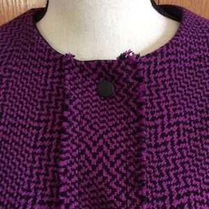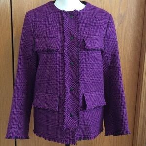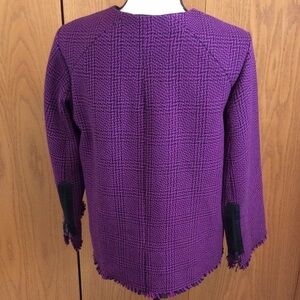 Beautiful purple and black tweed crew neck jacket with frayed edges. Two snap button front closure, flap chest pockets and side pockets. Zipper detail on the cuffs. Jacket is fully lined. Fabric is 31% polyurethane, 21% wool, 20% viscose and 11% polyester, 9% nylon and 8% acrylic. Approximate measurements laying flat: bust 20” across from armpit to armpit, sleeve length 23”, length 26”. Item in excellent like new condition. No stains, pulls or holes.