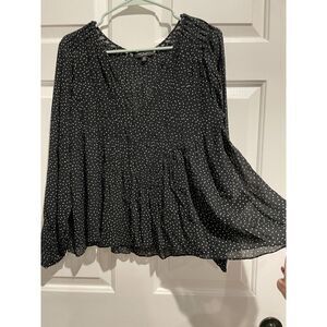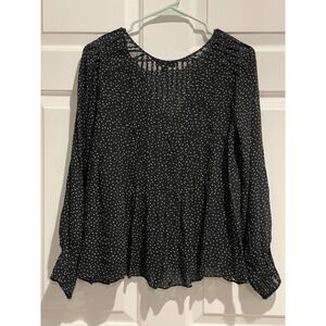A gauze-y sheer, all over polka dot print in a classic fit longsleeve blouse. Cut from 100% viscose with a hook and eye closure.