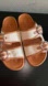 Stylish sandals with dual buckles. Cream straps with brown sole. Ideal for everyday wear.