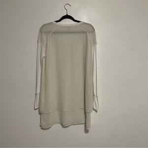 -Stunning peek-a-boo lining tunic with drop shoulders, wide neckline with knit banding trim, and side slits.