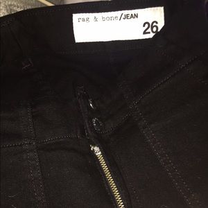 High-rise skinny jean with frayed carpenter pocketing detail and unfinished hemline. Frayed edges lend a deconstructed element to these sleek Rag & Bone/JEAN skinny jeans. 4 patch pockets. Snap closures and zip fly.