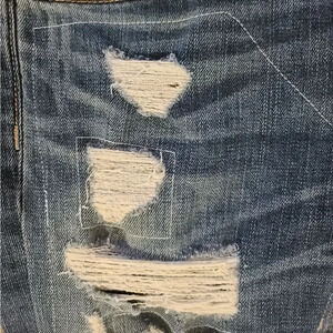 Extreme distressing through legs with repaired patchwork contrast denim.