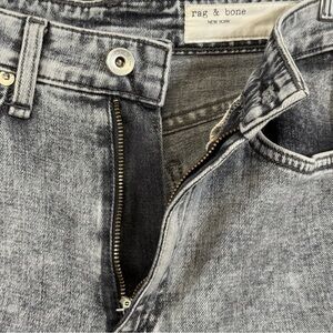 Rag & Bone Dusty Trail gray jeans with an edgy acid wash, slim straight cut, and high-rise waist. Five-pocket styling, zip fly, slight stretch. Size 25. Waist 13”, rise 11”, inseam 26”. Great with boots or sneakers for year-round wear. No flaws.