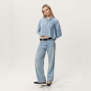 The Logan is a laid-back, wide-leg, mid-rise jean made from our ultra-light Featherweight denim. With a roomy cut through the hip and thigh, it doesn't get more comfortable than this. Available in Greenport, a light indigo wash with a clean hem. Pro tip: take your natural size and wear low on your waist for a relaxed look or size down for a higher rise.