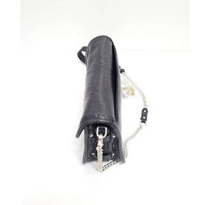 Calfskin crackled metallic leather clutch bag with adjustable/removable chain and leather shoulder strap (20.5" drop), Card slots at interior, Patch back pocket flap top with magnetic closure.....turn-lock closure