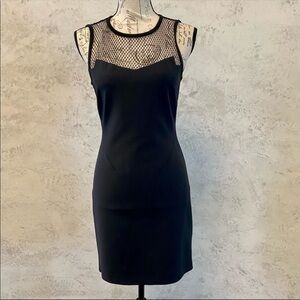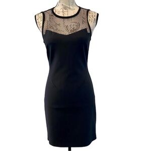 Rag & Bone Franklin Dress in black that features a mesh top, and round neckline with V-cut illusion. Made of nylon/spandex stretch fabric for a form-fitting silhouette, and exposed back zip closure. Fully lined. Size 2. Worn once and in excellent condition. *See photos for approximate measurements laying flat.
