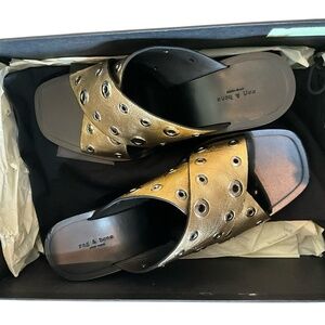 Step into style with these Rag & Bone mules, showcasing a luxurious gold and black color scheme. The studded embellishments provide a chic touch, while the open-toe design ensures a comfortable fit. Ideal for both casual and sophisticated settings, these mules are a versatile addition to any wardrobe.