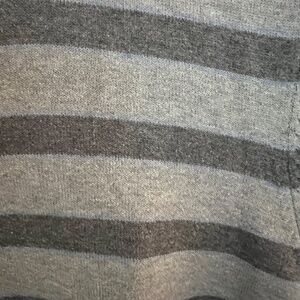 This gently worn Rag & Bone crew neck sweater in a mid-weight cotton features charcoal grey and thin powder blue stripes. Ribbed hem.
