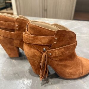 Rag & Bone Harrow Boot, Size 38, Caramel color in suede. Typical Suede leather markings, that can be brushed or left alone. Beautiful details, well made and in excellent very gently worn condition.