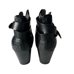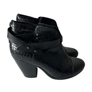 Rag & Bone Harrow Crocodile-Embossed Leather Booties in Black. Size 40 (US 10). Features round toe, block heel, crocodile-embossed leather upper, leather lining and sole, wrap around straps with metal closure. Excellent pre-owned condition.
