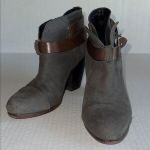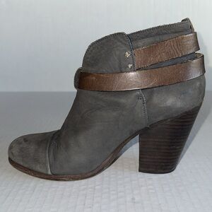 Rag & Bone Harrow gray with brown strap leather booties. 3 1/2” heels. Size 38 = US 7 1/2. Very good pre owned condition