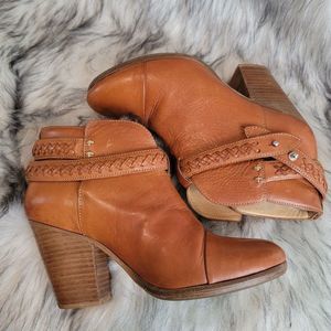 Pre-owned in great condition, re-soled with Vibram. Cognac Leather with braided strap. Front notch elongates legs.
