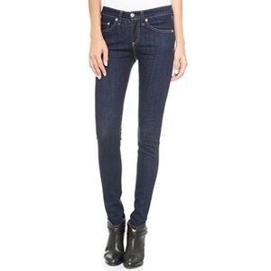 These skinny jeans feature 5-pocket styling and a single-button closure. Seam detail and contrast stitching at back pockets.