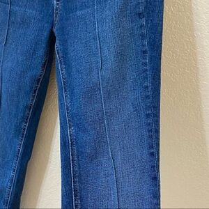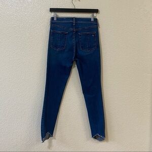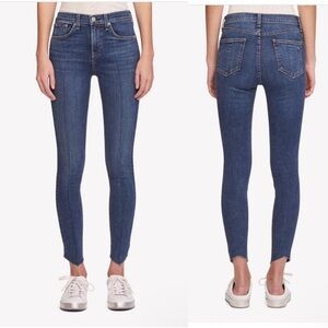 Rag & bone high-rise ankle skinny jeans in Manson wash. A cropped high-rise skinny fit jean with pintuck detailing on the front and a diagonal cut hem. Five-pocket design with zip-fly closure. 10oz stretch Japanese denim in a dark wash. 98% cotton and 2% poly blend. In excellent pre-owned condition.