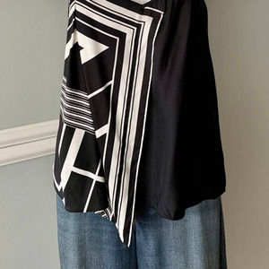 Asymmetrical cami with a custom scarf-inspired print great layering piece or worn by itself with your favorite jeans or pants.