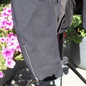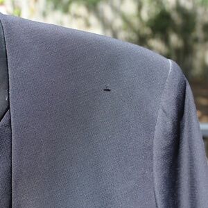 Rag & Bone jacket blazer with lamb leather collar. The jacket is a size 2, single button closure, zip pockets, and zip sleeves. Collar is 100% lamb leather and the body of the jacket is nylon and elastane. There is a tiny pull in the material on the left shoulder as seen in the photo. Otherwise, it is in excellent condition.