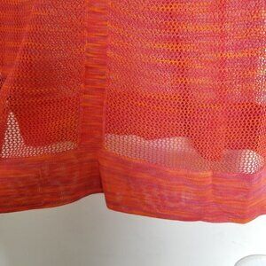 Sheer, mesh-knit pullover framed with solid trim at the seams, cuffs and hem