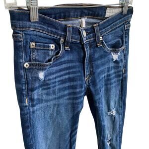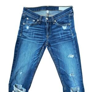 Rag & Bone Jean "Capri" jeans in the "DK Shredded" wash, featuring a mid-rise skinny fit with heavy distressing, rips, and a raw hem for a perfectly worn-in look. These cropped-length jeans are made from soft, stretchy denim, offering a comfortable yet flattering fit. The faded blue wash and edgy design make them a stylish choice for casual everyday wear, perfect to pair with sneakers or boots.
