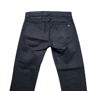 These Rag & Bone jeans for men in size 30 feature a black, solid denim fabric with a dark wash. They have a mid-rise and a skinny fit with a 5-pocket design. Made of cotton with added polyurethane for stretch, these jeans have a button closure and a waist size of 30 inches. The style is extra-slim, perfect for a sleek look.