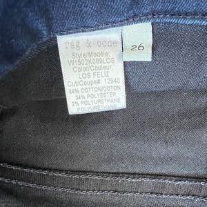 Rag & Bone Skinny Jeans in Los Feliz Dark Wash. Women's Size 26. Style W1502K089LOS. 64% cotton, 34% polyester, 2% polyurethane. There is some minor wear near the side seam.