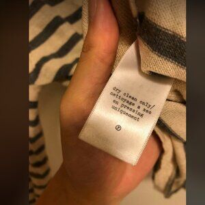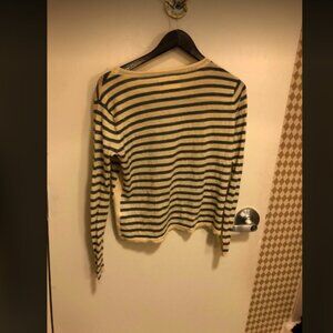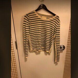 gently used condition. size small. striped crew neck style. gray and white/cream stripes. 100% Merino Wool.