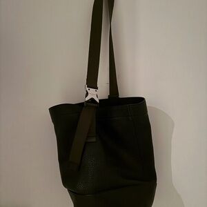 A true Rag & Bone classic in signature textured black leather. Very soft and roomy with a comfortable 'army green' web strap. In perfect condition inside and out. A chic city bag for running errands and looking like a boss!