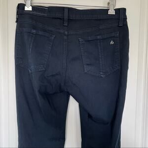 Good condition. Traditional closure, faux front pockets, functional back pockets. Bit of stretch.