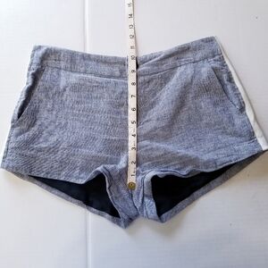 A navy pinstripe short featuring a leather white stripe down the sides and two front pockets. 70% cotton, 20% linen, 10% raime. Color: blue