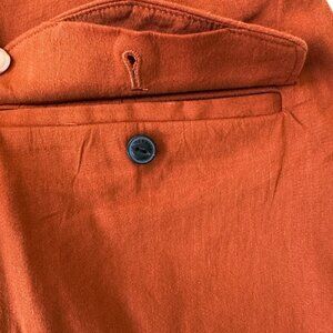 Rag & Bone linen-blend shorts in rust, featuring single front pleats, zip closure and back flap pockets. These are a women's size 8, with a 15.5" waist, 14" rise, and they fit true to size. Made with 59% Linen, 39% Viscose and 3% Elastane. Machine wash cold, dry flat, can be dry cleaned. In excellent preowned condition.