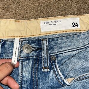 Rag & Bone Logan Mid-Rise Relaxed Wide Leg Jeans Distressed Vandam Light Wash 24. The Logan is a laid back, wide leg, mid-rise jean made from our ultra-light Featherweight denim. With a roomy cut through the hip and thigh, it doesn't get more comfortable than this. Zip fly with button closure. 5-pocket styling. Fading and whiskering at front. Structured denim fabric with intentional distressing throughout. Pro tip: take your natural size and wear low on your waist for a relaxed look or size down for a higher rise. Approx measurements: 11.5“ rise, 30.5“ inseam, & 13.75“ waist. Great pre-owned condition. No stains/flaws. Smoke/pet free home. Offers welcome. Bundle & save. Ship same/next day. Packaged w/ care.