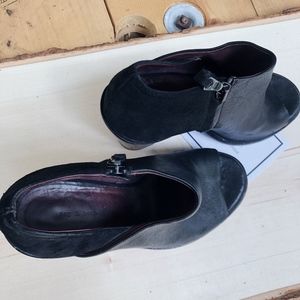 •Features: Black matte calf leather and Black suede with wood chunky heel. Has a peep toe making it appropriate for all seasons. Side zipper closure.